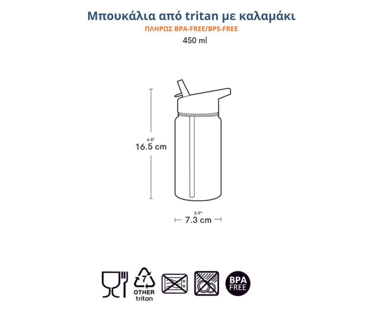 Το εργονομικό του μέγεθος (450ml) χωράει εύκολα σε κάθε παιδική τσάντα. Κατασκευασμένο από ασφαλή υλικά: Tritan & PP, χωρίς BPA, μόλυβδο ή φθαλικές ενώσεις.