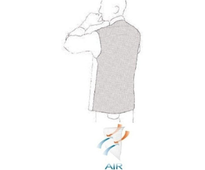Το σακάκι έχει ειδική σύνθεση στην πλάτη που επιτρέπει στο σώμα να αναπνέει και πλάγιο κούμπωμα με καλυμμένα τρουκ, ενώ διαθέτει τσέπη στο στήθος και στο μανίκι για στυλό / θερμόμετρο.