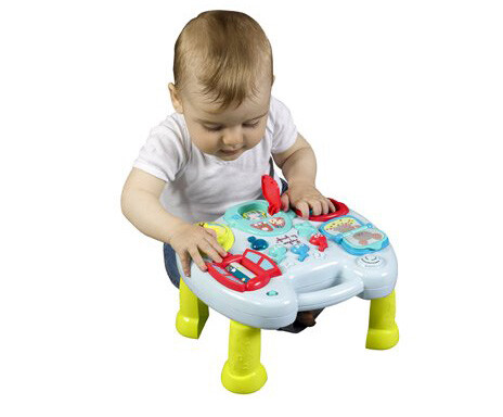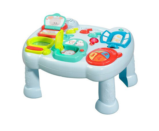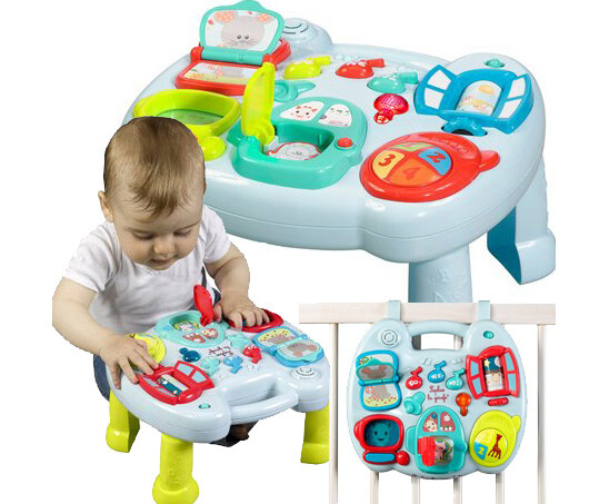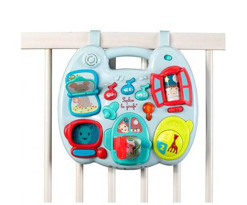 Ένα μουσικό βιβλιαράκι, τρεις μουσικές νότες, ένα όμορφο κουδουνάκι με μια αστεία μελωδία, ένα παιχνιδάκι που κυλάει και δείχνει στο μωρό την μέρα και την νύχτα, ένα τηλεφωνάκι με αστείο ήχο, μια πόρτούλα που ανοίγει όταν χτυπάει το κουδούνι και αποκαλύπτει τον Λάζαρο τον γάτο να νιαουρίζει και τέλος την Σόφι να κάνει ματάκια με έναν χαρούμενο ήχο. Όσο το μωρό είναι μικρό μπορείτε να το κρεμάσετε και να είναι απλά ένα ταμπλό δραστηριοτήτων, μεγαλώνοντας μπορείτε να βάλετε τα ποδαράκια και να είναι ένα πρακτικό τραπεζάκι.