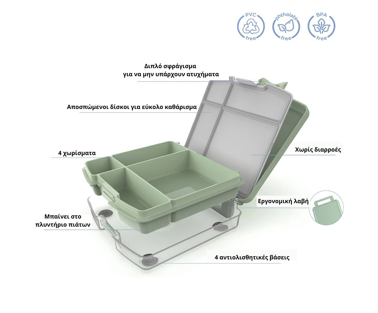 Το ιδανικό σκεύος για να μεταφέρετε υγιεινά, σπιτικά γεύματα και snack εκτός σπιτιού! Διαθέτει τέσσερα χωρίσματα για να μπορείτε να αποθηκεύσετε ένα πλήρες γεύμα και λαβή για να το μεταφέρει εύκολα ακόμα και το παιδί! ◼️Με διαχωριστικά για να μην αναμειγνύονται τα γεύματα μεταξύ τους ◼️Με αποσπώμενο δίσκο για να πλένεται πανεύκολα ◼️Με λαβή-χερούλι ◼️Με αντιολισθητικές βάσεις στο κάτω μέρος για να μην μετακινείται καθόλου